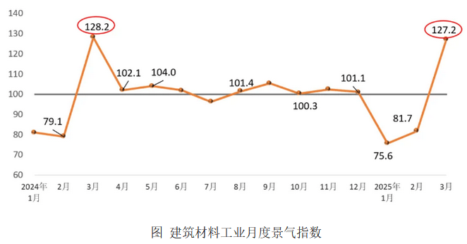 2025年3月份建建材料工业景气指数为127.2点,鞭策建建材料工业景气宇回升。